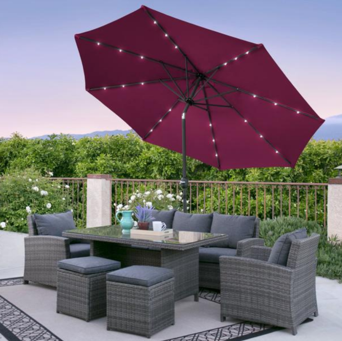 This large patio umbrella comes in three colors and has built-in LED lights that are powered by solar panels and last 6 – 7 hours between charges. This umbrella is also water and fade-resistant and can be tilted to keep the sun out no matter the time of the day. The umbrella stand is not included.