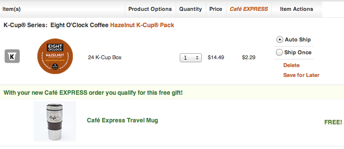 Plus when I checked out just for starting up a Cafe Express account I got a FREE Cafe Express Travel Mug! Shipping was $5.95, making my total shipped just $8.24 for 24 K-Cups ($.34 each!) and a FREE Travel Mug!!!