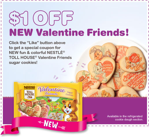 Just “like” their page and then click on the coupon tab to get $1 off 1 package of Nestle Toll House Valentine Friends Sugar Cookies. Yum!