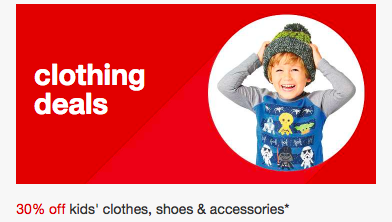 Hurry on over to Target where they are offering up 30% off Kids Clothes, Shoes and Accessories when you enter promo code COLD at checkout!