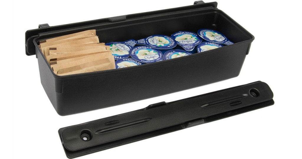 These storage bins easily attach to the front of your shelves with the included shelf tracks. Fill them with smaller items like K-Cups, spices, sugar packets, office supplies and more.