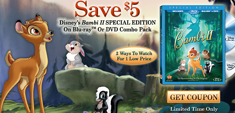 Head over here and you can print a coupon for $5 off the Bambi II BluRay or DVD Combo Pack — this just came out today so there should be some good deals on these at Target and Walmart!
