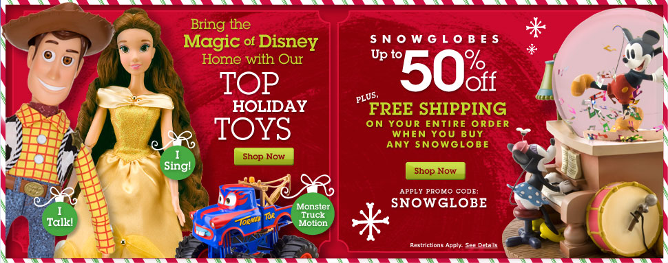The Disney Store has 50% off all Snow Globes right now. PLUS, when you buy a snow globe you get FREE shipping on your order! Use promo code SNOWGLOBE when checking out.