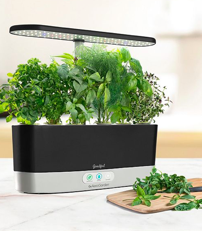 This countertop garden features LED grow lights and a system that reminds you when to water and feed your plants. The LED lights will automatically turn on or off or you can manually adjust the lighting. The seed kit includes Genovese basil, curly parsley, dill, mint, thyme, Thai basil and Miracle-Gro plant food.