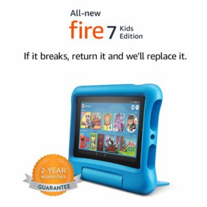 Fire 7 Kids Edition Tablet includes a Kid-Proof Case with built-in stand, 1-year of Amazon FreeTime Unlimited, and a 2-year worry-free guarantee.