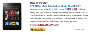 WOOHOO!!!! If you have wanted a Kindle Fire HD --- you need to HURRY over to Amazon right NOW! Their deal of the day is $70 off the Certified Refurbished Kindle Fire HD 8.9"!!! This is a HUGE savings -- marking it all the way down to just $129!! Today only, get $70 off a certified refurbished Kindle Fire HD 8.9" 16 GB Wi-Fi tablet. … [Read more...]