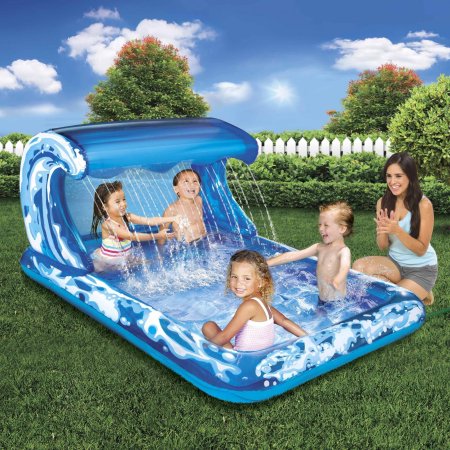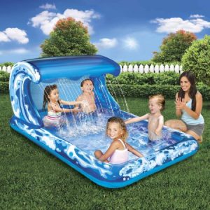 The best place to cool off this summer is the Big Waves Splash Park! Kick back in this roomy pool under the shady, waterfall canopy. The unique, wave-shaped canopy has a built-in sprinkler that creates a waterfall effect. In the shade or sun, either way it’s summertime fun!