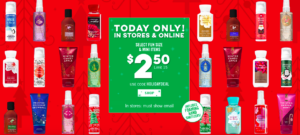 Today, November 27th only, head over to Bath & Body Works where they are offering select Fun Size & Mini Size Products for just $2.50 both in-store and online (limit 15)! If you plan to shop online, just use the promo code HOLIDAYDEAL at checkout! If you’re headed in-store, be sure to check your email for the coupon that you will need to … [Read more...]