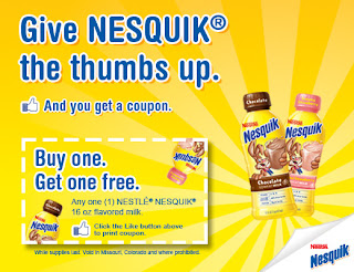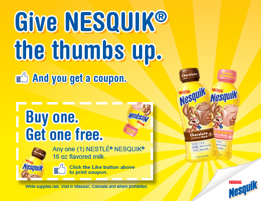 Buy 1 Get 1 FREE Nesquik CouponJanuary 25, 2011 by Wheel 'n Deal Mama Leave a CommentTweetPinShare0 SharesHead over to the Nestle Nequik Facebook Page and you can print a BOGO Coupon!Paired with a good sale you could score a great deal!TweetPinShare0 Shares
