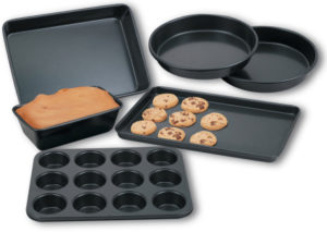 Includes: Two 8-inch Round Cake Pans, One Medium Loaf Pan, One 9×13-inch Cake Pan, One 12-Cup Muffin Pan, One 10×15-inch Baking Sheet.