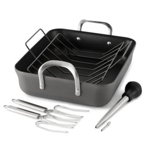 This set includes a 16-inch roasting pan with rack, two stainless steel lifters, and injection baster. The roasting pan can hold up to a 25-pound turkey!