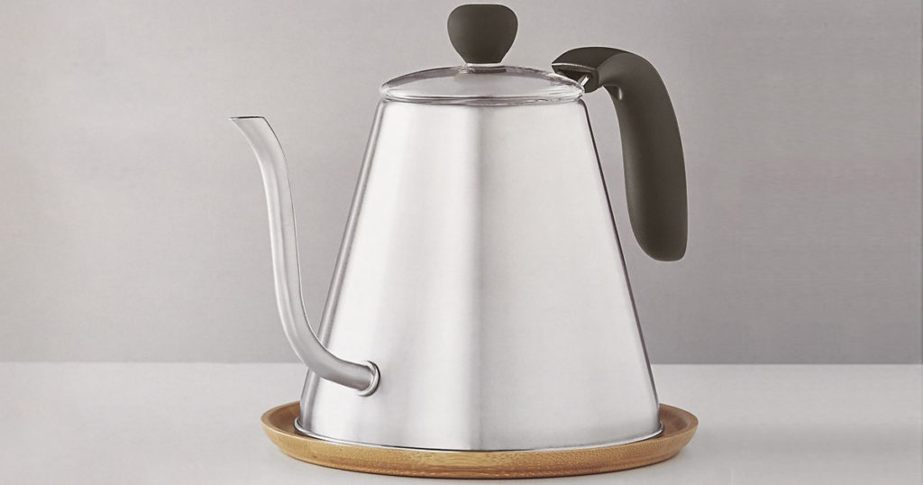 This kettle makes up to 34-ounces of coffee and other hot beverages and features a heat-resistant handle and a gooseneck spout.