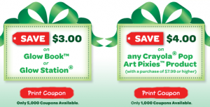 Hurry on over to the Crayola Facebook Page, you can print a $3 off a Crayola Glow Book or Glow Station coupon and a $4.00 off any Crayola Pop Art Pixies Product coupon! There are very limited quantities of both so please only print if you are going to use them and go NOW to print! :) (Thanks, Raining Hot Coupons!) … [Read more...]