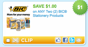 This coupon is BACK and appears to have reset?!?! HOT coupon --- print it now while you can! :) Here's a great Back to School coupon for you!! Head over to coupons.com and you should see a coupon for $1.00 off any 2 Bic Stationery Products coupon! This is sure to make for some very inexpensive school supplies with all the Back to … [Read more...]