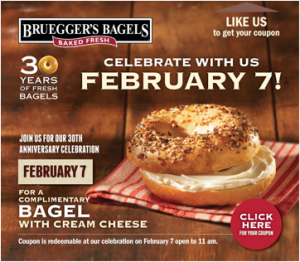 Do you have a Bruegger's Bagels nearby?! If so, you may want to pop in tomorrow! In celebration of their 30th anniversary, you can get a complimentary Bagel with Cream Cheese!! NO Purchase is necessary! Coupon is redeemable from open to 11am only. Head over to the Bruegger's Facebook Page to get your coupon! Plus, while you are at … [Read more...]