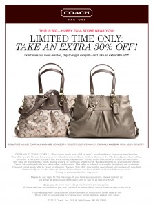 Sweet! If you have a Coach Outlet nearby -- you can use this 30% off coupon through tomorrow 7/24! This is a GREAT way to save on Coach items. My closest outlet store is about 40 minutes away but totally worth the trip when you can really get a HUGE savings. Print the coupon here. (Thanks A Few Shortcuts) … [Read more...]