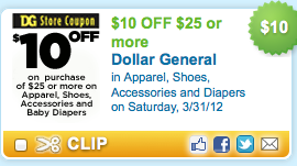 Woohoo!! Here is another HOT coupon that you definitely want to print! Hurry over to coupons.com and use the zip code 12345 as needed to print this coupon for $10 off any $25 or more purchase at Dollar General in Apparel, Shoes, Accessories and Diapers -- valid 3/31/12 only. I am sure there are many great deals you can score with this … [Read more...]