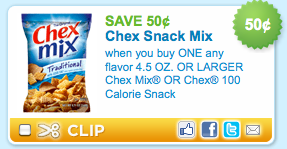 Sweet! You can get bags of Chex Mix this week for only $.50 with this new coupon!Head over here and print this $.50/1 Chex mix coupon. Use the zip code 65751 as needed.Dollar General has Chex Mix for $1 a bag this week per their ad so you can either grab it there or price match at Target or Walmart! … [Read more...]