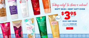 Today, November 19th only, Bath & Body Works is offering select Body Creams for just $3.95 (regularly $13.50) both in-store and online!! There is a limit of 15! If you plan to shop online, just enter the promo code SNOWGLOW at checkout. If you’re headed in-store, be sure to check your email for the coupon … [Read more...]
