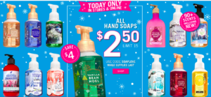 Today Only , November 17th or while supplies last, head over to Bath & Body Works where you can get Hand Soaps for just $2.50 each when you use the promo code SOAPLOVE at checkout! There is a limit of 15, and this sale is offered both in-store and online! If shopping in store, prices will be adjusted at checkout and no coupon code is … [Read more...]