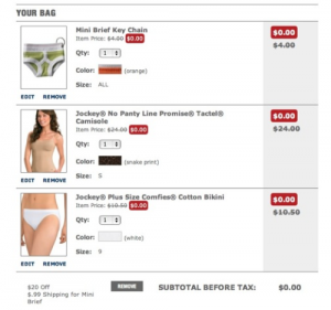 SWEET!!! ! Another HOT deal you can snag over at Jockey.com!! How to get this deal Head on over here and sign up for Catalog Spree (free to sign up) and you will receive an email to get your FREE $20 Jockey gift card then it will come in your e-mail with in a few minutes of signing up! Head on over to Jockey Buy (1) Jockey Cheeky Modal … [Read more...]