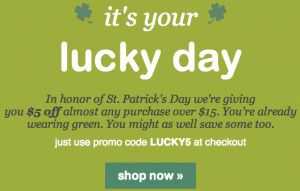 Woohoo! In honor of St Patrick's Day, Living Social is offering of $5 off any $15+ purchase!! This is valid through the end of tonight only. Use the promo code LUCKY5 at checkout and you will get this discount. There are a lot of great national deals and of course deals local to you as well! Head over to Living Social … [Read more...]