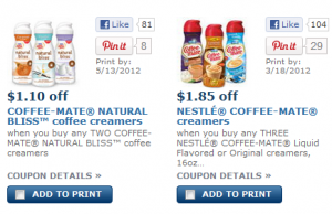 Yay!!! New high value CoffeeMate coupons!! The Coupon Network just released a couple new Coffee-Mate coupons that you are going to want to print! Take $1.10 off any TWO Coffee-Mate Natural Bliss Coffee creamers and take $1.85 off any THREE Coffee-Mate Liquid Flavored or Original Creamers. Personally, I can't drink my coffee without some … [Read more...]