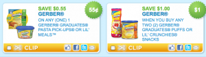 Here are a few MORE coupons you will want to print if you have a little one! $1.00 off ANY 1 GRADUATES LIL' ENTREES $.55 off 1 GERBER GRADUATES PASTA PICK-UPS $1.00 off 2 GRADUATES YOGURT OR VEGGIE MELTS $1.00 off ANY 2 GRADUATES PUFFS OR LIL CRUNCHIES Plus, these pair up very nicely with several deals at … [Read more...]