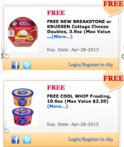 Wow!! If you are a Commissary shopper - hurry over to the Commissary Rewards Site and you can load both a coupon for a FREE Cool Whip Frosting, 10.6oz (Max Value $2.20) coupon AND a FREE Breakstone or Knudsen Cottage Cheese Doubles, 3.9oz (Max Value $0.72) to your card! Go quickly as I am sure these will be gone fast! … [Read more...]