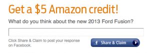 AND DONE! Hope many of you got it! WOW!!! You are going to want to HURRY for this one!! Amazon is right now offering a FREE $5 Amazon Credit for giving your feedback on Ford Fusion!! Your Facebook account must be connected to Amazon to claim the promotional credit. Upon successful completion of the Share & Claim … [Read more...]