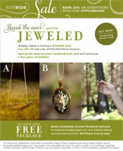 WOW!!! See below: Share their sale of 20% off at Shabby Apple using the promo code JOYFULSEASON on your facebook page --- take a screen shot and email the screen shot to freejewelry@shabbyapple.com with your pick from the three above and your address for a FREE piece of jewelry!! Be sure to check out their sale too! (Thanks The … [Read more...]