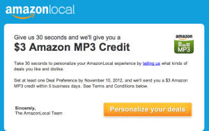 Woohoo!!! Are you signed up with Amazon Local? If you aren't -- sign up NOW!! They have some HOT deals on the regular, often freebies too. If you are already, check your emails! I just got an email with this offer in it! A FREE $3 Amazon MP3 credit just for personalizing my Amazon local account with what deals I like! Sounds pretty good to … [Read more...]