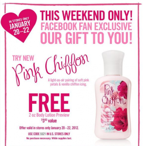 Bath & Body Works: FREE Pink Chiffon 2oz Lotion! (exp 1/22)