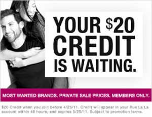 Yay!! Rue La La has this awesome promotion back again!Head over here and sign up now with Rue La La for a FREE $20 credit - just for signing up! The last time they did this many were able to snag some FREE or very inexpensive items before the credit expired (expires 5/25).Sign up before the 25th to get the credit!NOTE: The credit may take up to 48 … [Read more...]