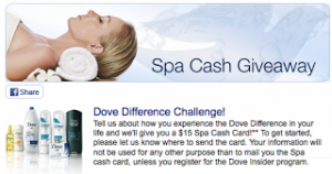 Hurry over and like the Dove Facebook Page!Right now they are giving away 4500 $15 Spa Cash Cards, I'm sure this will go fast. … [Read more...]