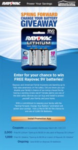 Head over and like the Rayovac Facebook Page here. At 2pm EST they are giving away 2000 Free Lithium 9V Battery Packs and 1000 regular 9V Battery packs!I'm sure they will go quickly, so you'll want to be on their page right at 2pm EST to snag your's. … [Read more...]