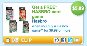 Over on Coupons.com right now you can print a coupon for a FREE Hasbro card game when you buy any Hasbro game for $9.99 or more!Combined with a good sale/coupon this could definitely make for a great deal. Plus, if you head over here to the Hasbro Facebook Page, you can actually print a coupon for $4/1 the Scrabble Flash game. … [Read more...]