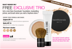 If you have a Sephora store nearby this is an awesome freebie!Head over here and print a coupon for a FREE Bare Escentuals Trio (foundation, primer and brush!). Wow! I wish I had one nearby! It is not good in the JCP Sephora shops unfortunately. … [Read more...]