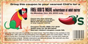 Tomorrow, Chili's offering FREE kid's meals with the purchase of an adult entree. If you were planning on heading out to dinner tomorrow, that is a great way of cutting back on the cost!Print the coupon here. Good tomorrow, 12/20 only. … [Read more...]