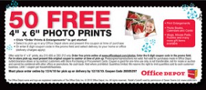 Print your coupon for 50 FREE 4X6 Photo Prints from Office Depot. Order your prints online by 12/4 and pick them up by 12/18. … [Read more...]