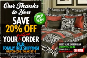 Cyber Monday has already started over at Linens N Things!You can get 20% off your whole order, plus FREE shipping. Cursory glance shows some decent discounts already on some of their bedding, plus using the promo code THANKS2010 you get an additional 20% off. Check it out here. … [Read more...]