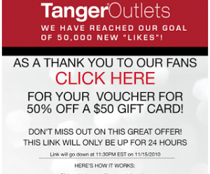 *Hot* $50 Tanger Outlets Gift Card for $25!