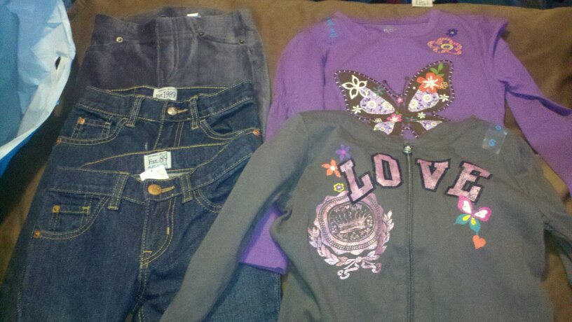 I got everything in the picture above, plus a little sparkly purse for my daughter (which she refused to allow me to photograph… ;)) all for under $25!!! Considering these are Fall clothes, I thought that was pretty good! That includes two pairs of jeans, a pair of corduroy leggings, a long sleeve graphic shirt and a light hoodie!! Oh, and I must not forget the purse. (That was probably the most expensive item I bought… but there was no way I was making it out of the store without it with her in tow. LOL)