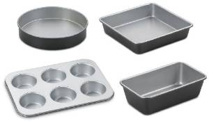 - 9-inch loaf pan, 9-inch square cake pan, 9-inch round cake pan, and 6-cup muffin pan