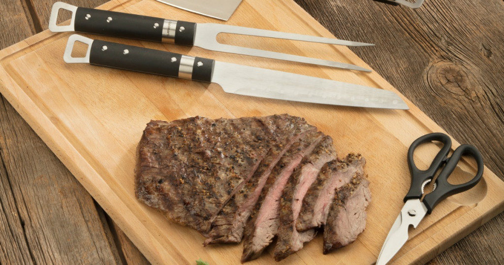 This grill set includes a TriTip Spatula, TriTip Tongs, Carving Fork, Butcher Knife, and Multi-Purpose Shears. All of the tools are made of professional grade stainless steel and have ergonomic plastic handles with integrated hanging loops. Plus, the spatula has a bottle opener and a cutting edge on it!