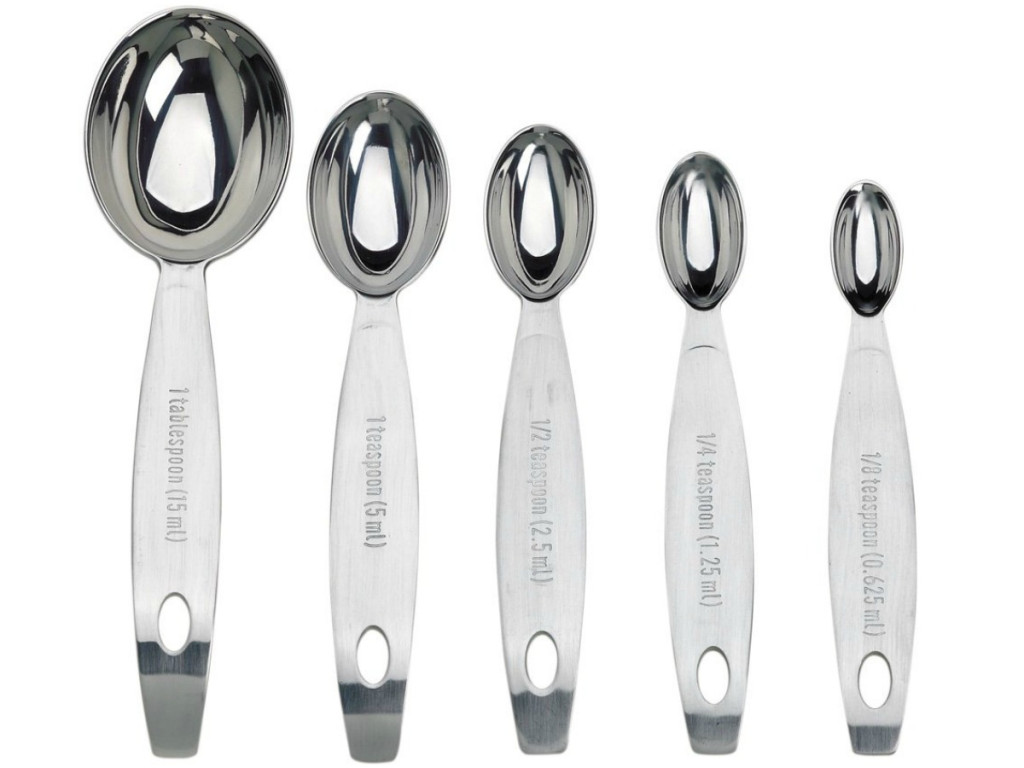 This set is made of stainless steel and includes 1/8, 1/4, 1/2, 1 teaspoon, and 1 tablespoon. Each spoon is oval-shaped to easily fit into spice jars and features gently curved handles so the spoons can sit on the counter without tipping over. They also have permanently stamped measurements on the handles, are attached to a removable loop and nest for storage.