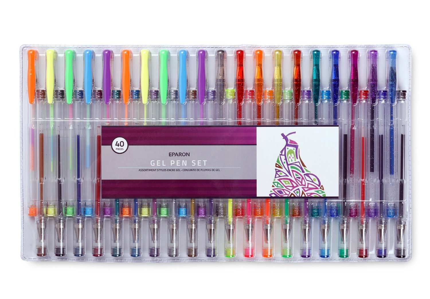 The Eparon 40-piece gel pen set provides an assortment of vibrant colors to nurture your creative talent and create beautiful works of art. This set offers a selection of standard, neon, pastel, glitter and metallic colors- everything you need to breathe life into your next masterpiece. Each pen features a transparent barrel allowing for quick and easy identification and organization. They can be used for a variety of artistic applications, from drawing, sketching and doodling to multimedia projects and, of course, those beloved adult coloring books on the market.