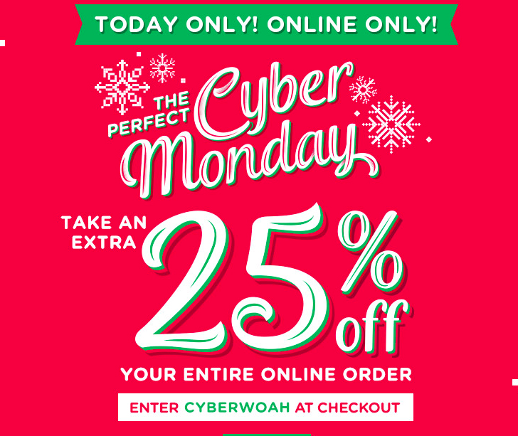 Head to Bath and Body Works where today only for Cyber Monday you can get an extra 25% off your entire online order!! Just enter CYBERWOAH at checkout!