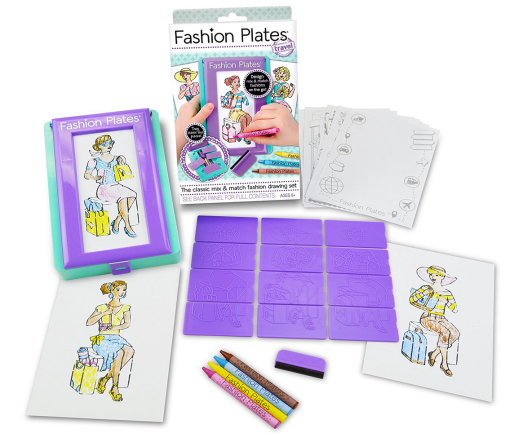 This compact travel kit includes 8 Fashion Plates, 2 rubbing crayons, and more!