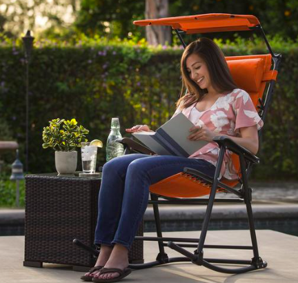 This ergonomic rocking chair features a detachable pillow headrest and comfortable material to make it the perfect seating solution for the lawn, pool, beach, campsite, or park. The attachable canopy provides shade and protection from the sun so that you can stay cool and comfortable outside on warm days.